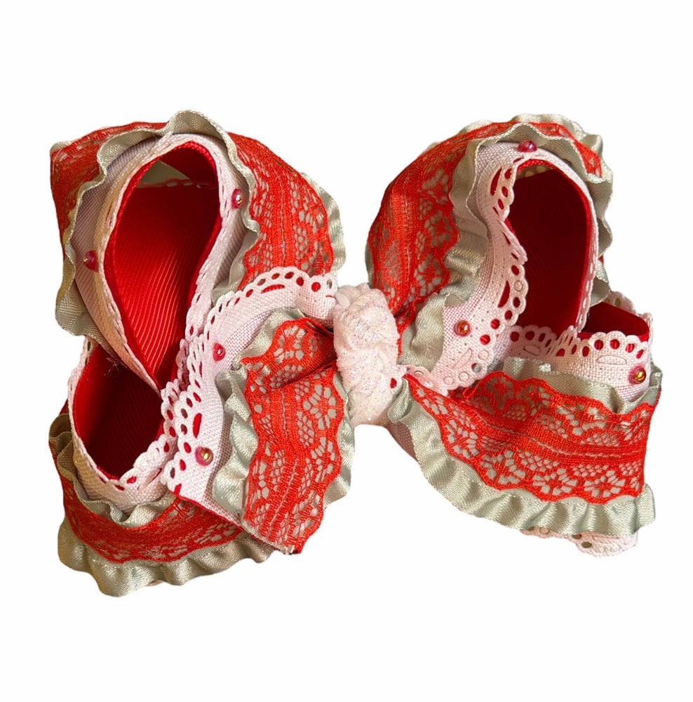 A gorgeous 4 layer bow. It has scalloped edges, ruffles, pearls- what more could we ask for?🥰