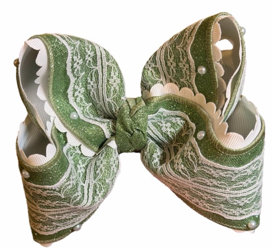 Green glitter with lace and pearls