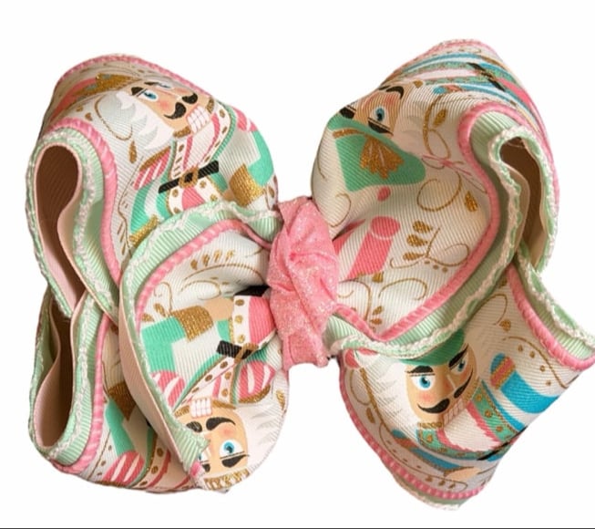 3 inch mint moonstitch, backed by pink moonstitch, topped with 2.5 nutcracker ribbon and a sparkly twisty knot.